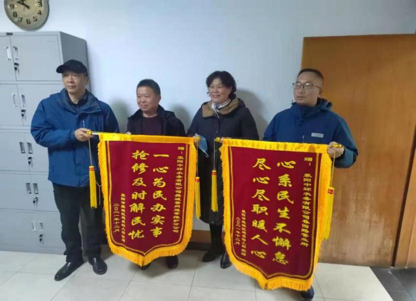 12月24日,建昌幼兒園劉校長將兩面分別繡著“一心為民辦實事 搶修及時解民憂”和“心系民生不懈怠 盡心盡職暖人心”的錦旗送到了襄陽中環水務有限公司,劉校長激動地說:“謝謝你們這么快地給我們解決了大問題!你們是真正地為民服務呀!”