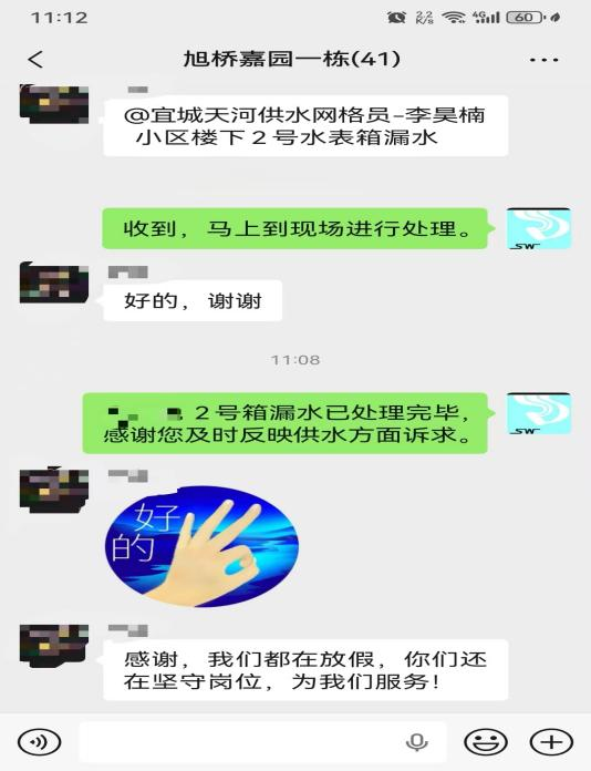 “感謝,我們都在放假,你們還堅(jiān)守崗位,為我們服務(wù)!”10月5日11時(shí)08分,宜城市旭橋嘉園小區(qū)業(yè)主李女士在小區(qū)業(yè)主群里,向襄陽(yáng)水務(wù)集團(tuán)宜城天河供水有限公司網(wǎng)格員李昊楠發(fā)來(lái)感謝消息。而就在23分鐘前,她剛反映家中停水問題,現(xiàn)在水管故障已徹底解決,如此高效的服務(wù)響應(yīng)讓業(yè)主倍感貼心。
